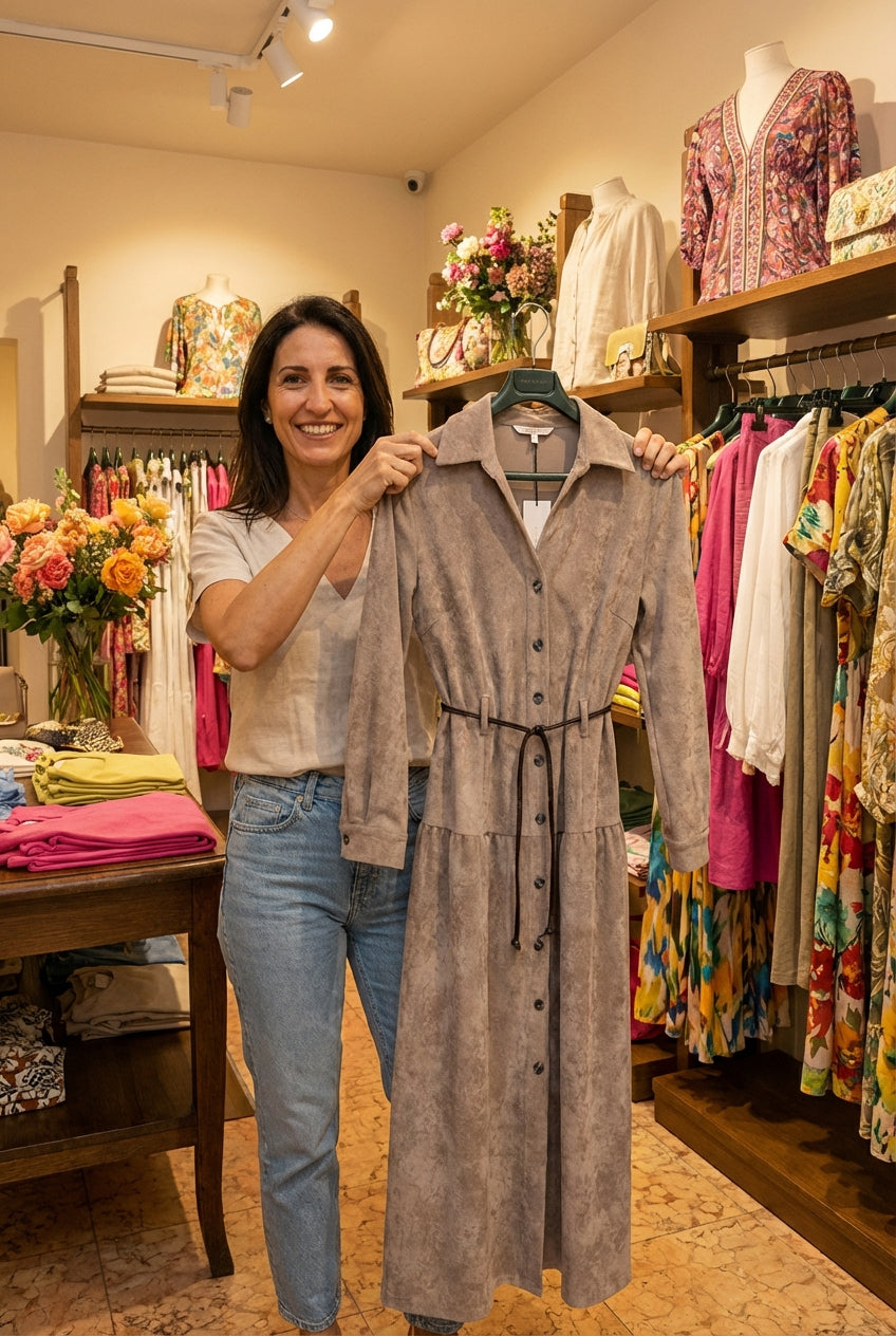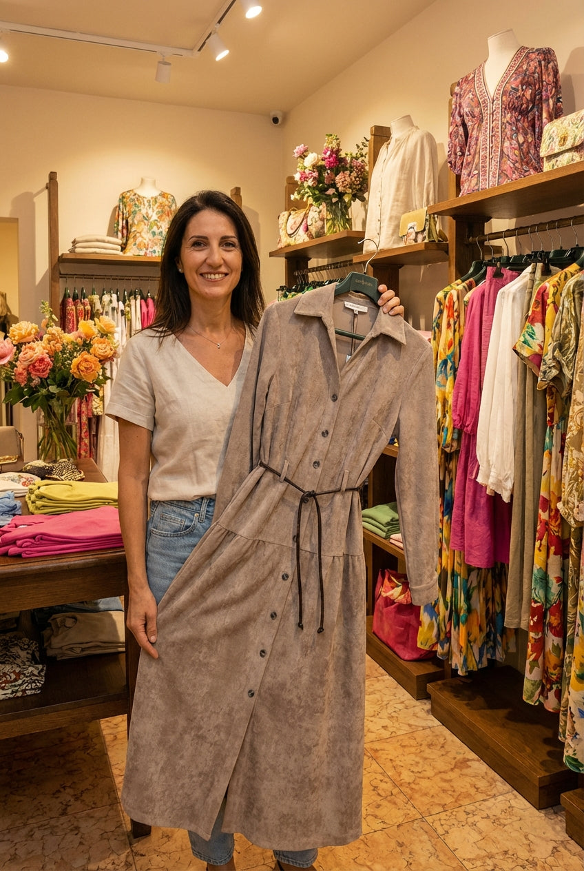 Perfetto per trasformare ogni giorno in un'avventura urbana, questo abito lungo abbraccia la silhouette con una semplicità disinvolta. Il colletto classico e la scollatura a v aggiungono un tocco di eleganza mentre i bottoni frontali completano il look con praticità. Ideale per chi ama distinguersi con grazia nelle strade della città.